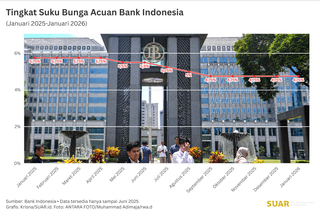 - Merespon tren pelemahan nilai tukar rupiah yang mendekati level Rp 17.000, Rapat Dewan Gubernur (RDG) Bank Indonesia (BI) Januari 2026 memutuskan untuk mempertahankan BI Rate sebesar 4,75%. Keputusan ini juga untuk menjaga laju pertumbuhan ekonomi. Untuk membantu stabilitas nilai tukar, BI akan mengandalkan kebijakan dan instrumen moneter lainnya seperti intervensi pasar. Sepanjang tahun ini, sejak akhir Desember 2025 hingga 20 Januari, nilai tukar rupiah telah melemah 1,54% sehingga pada berada pada level Rp 16.945 per USD.