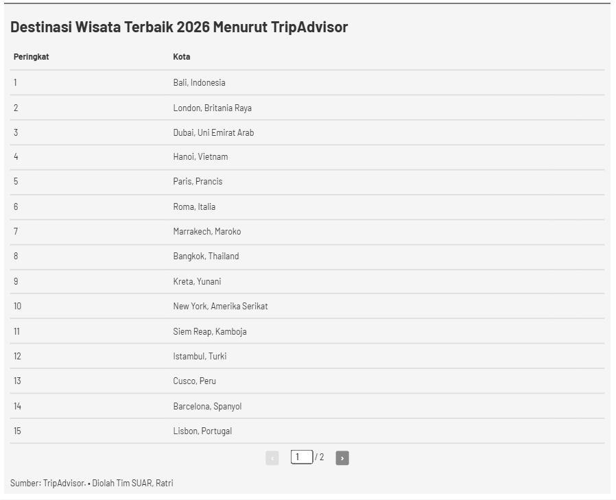 - Dalam Travelers' Choice Award 2026 Bali, Indonesia, sukses mengukuhkan posisinya sebagai destinasi wisata terbaik nomor satu di dunia, sebuah pencapaian yang kian mempertegas bahwa eksotisme budaya dan alam nusantara tetap menjadi magnet utama wisatawan global. Tidak hanya Bali, beberapa kota besar lain di ASEAN seperti Bangkok (Thailand), Siem Reap (Kamboja), dan Hanoi (Vietnam) juga turut masuk dalam daftar tersebut. Hal ini menunjukkan bahwa setiap sudut kawasan Asia Tenggara memiliki karakter unik yang diakui secara internasional.
