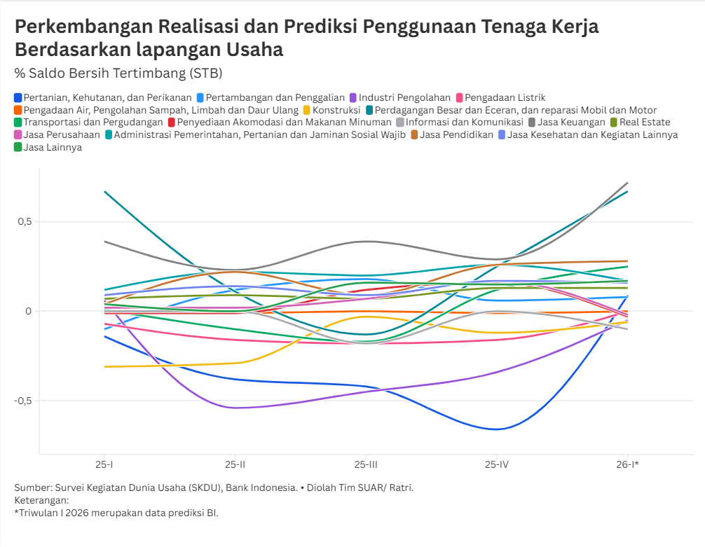 - Hasil Survei Kegiatan Dunia Usaha (SKDU) Bank Indonesia menunjukkan setelah sempat terkontraksi selama dua triwulan sebelumnya, realisasi penggunaan tenaga kerja pada triwulan-IV 2025 akhirnya berbalik positif dengan Saldo Bersih Tertimbang (SBT) sebesar 0,72%. Kondisi ini didorong oleh peningkatan aktivitas domestik selama periode Hari Besar Keagamaan Nasional (HBKN) Natal dan Tahun Baru, yang memicu kebutuhan sumber daya manusia tambahan di sektor-sektor strategis, seperti jasa pendidikan, perdagangan, serta transportasi dan pergudangan.