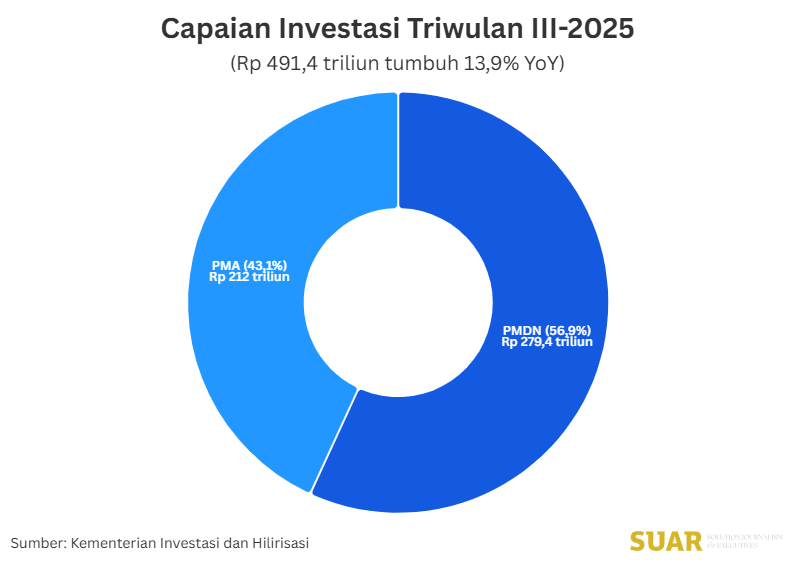 - Kementerian Investasi dan Hilirisasi/Badan Koordinasi Penanaman Modal (BKPM) mencatat pada triwulan III–2025, realisasi investasi mencapai Rp 491,4 triliun, naik 13,9% YoY. Bila diperinci, 56,86% berasal dari penanaman modal dalam negeri (PMDN), cetak rekor tertinggi sejak 2007.