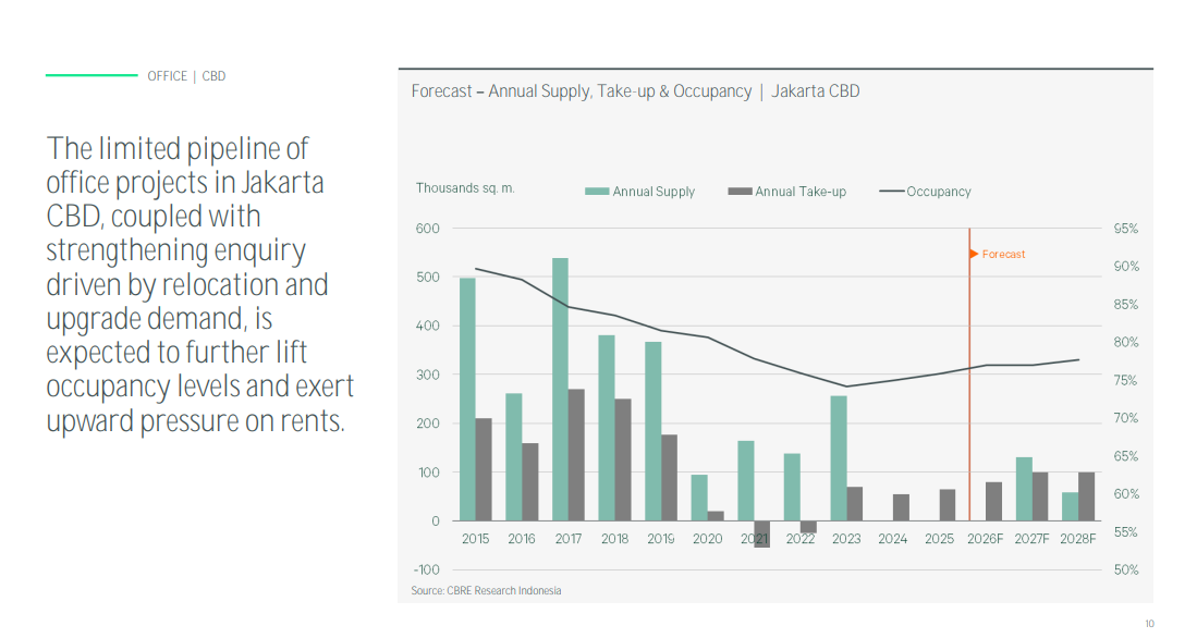 "Okupansi pergudangan menjadi yang tertinggi pada akhir 2025, mencapai 95% dengan take up tahun lalu sekitar 365.000 meter persegi. Umumnya ini diambil oleh perusahaan logistik pihak ketiga, e-commerce, dan manufaktur FMCG. Meski demikian, karena supply yang cukup melimpah, maka harga sewa tidak mengalami kenaikan terlalu tinggi," jelas Anton.