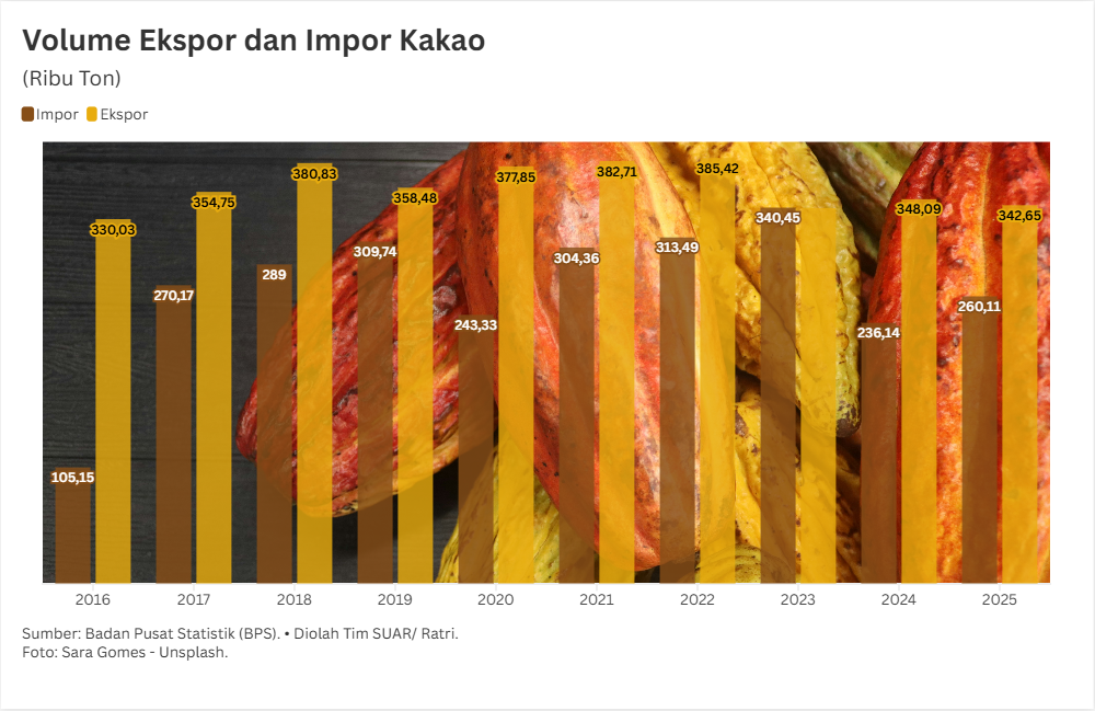 - Data Badan Pusat Statistik periode 2016-2025 menunjukkan volume ekspor kakao secara konsisten di atas angka 300 ribu ton per tahun. Meski sempat mengalami defisit perdagangan sebesar 0,46 ribu ton pada tahun 2023, Indonesia kembali mencatatkan surplus di tahun-tahun berikutnya. Pada tahun 2025 surplus tercatat sebesar 82,54 ribu ton. Dengan surplus ini, Indonesia menjadi pemain net eksportir di pasar kakao internasional.