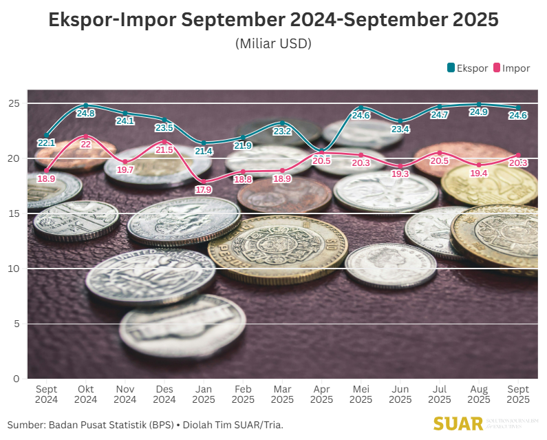 - Badan Pusat Statistik (BPS) melaporkan neraca perdagangan Indonesia pada September 2025 kembali surplus, sebesar USD 4,34 miliar. Capaian ini menandai keberlanjutan tren positif selama 65 bulan berturut-turut sejak Mei 2020. Secara kumulatif nilai surplus perdagangan sepanjang Januari hingga September 2025 mencapai USD 33,48 miliar, naik USD 11,30 miliar dibandingkan periode yang sama tahun lalu.