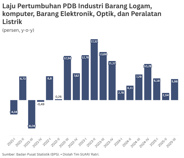 Industri barang logam, komputer, barang elektronik, optik, dan peralatan listrik di Indonesia masih didominasi oleh produk jadi seperti telepon pintar, televisi, atau komputer. Sayangnya, industri hulunya masih bergantung pada impor. Indonesia perlu mengembangkan hilirisasi semikonduktor.