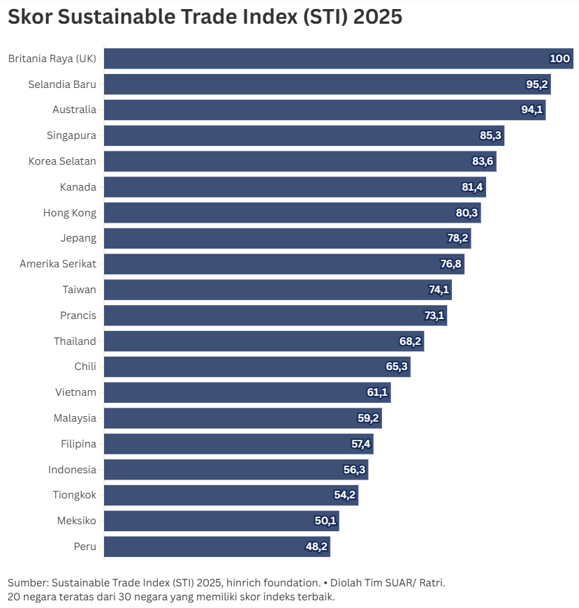 Laporan Sustainability Trade Index (STI) 2025 mengklasifikasikan Indonesia sebagai Modernisator Selektif. Klasifikasi ini menggambarkan Indonesia adalah negara yang secara selektif memilih area-area yang strategis untuk dimodernisasi guna meningkatkan posisi tawar dalam rantai perdagangan global.