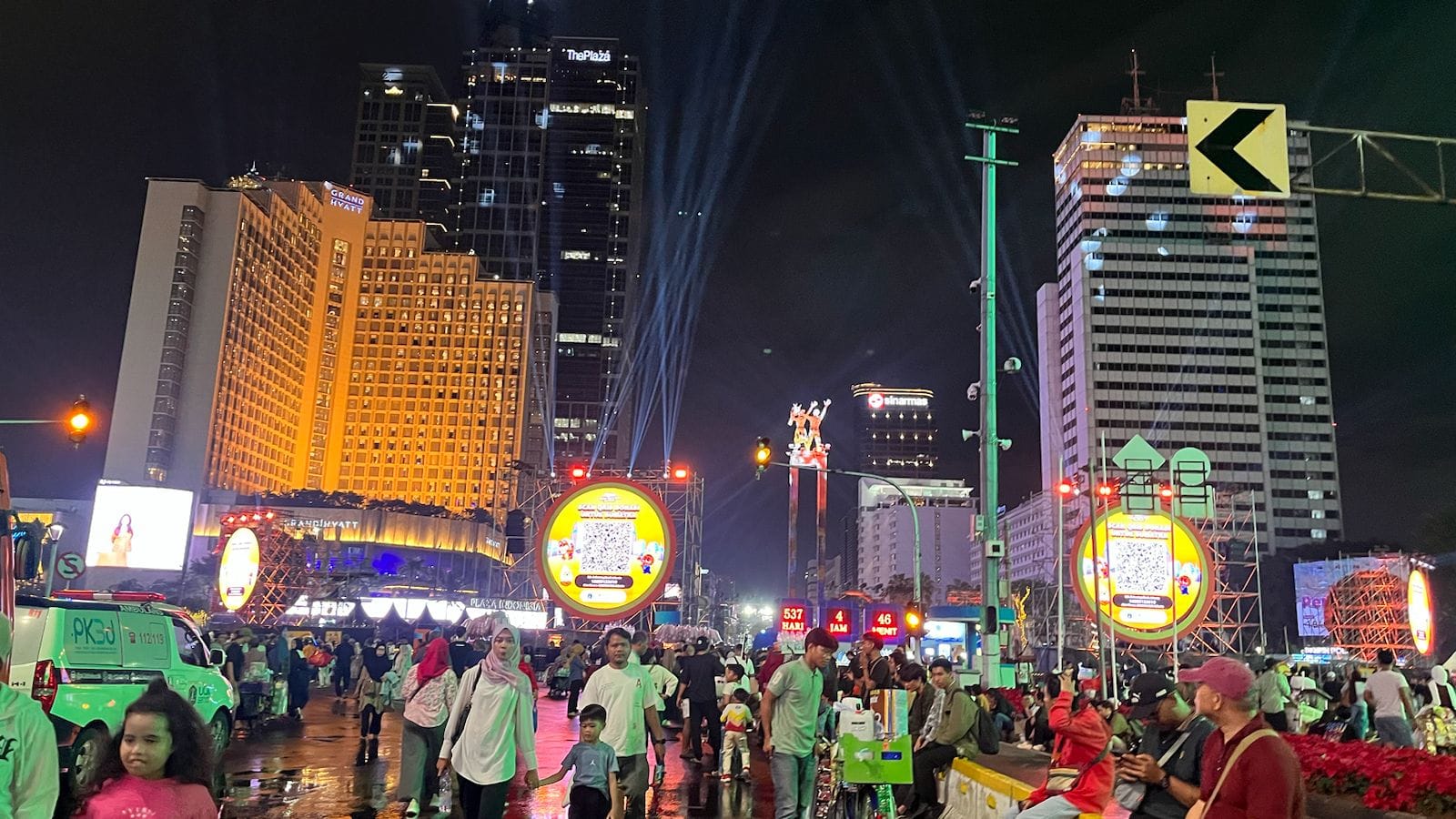 Di sekitar bundaran Hotel Indonesia, warga tetap berdatangan. Ada yang duduk lesehan di trotoar, ada yang berdiri memandangi video mapping di layar besar, ada pula yang sekadar berjalan sambil berbincang.