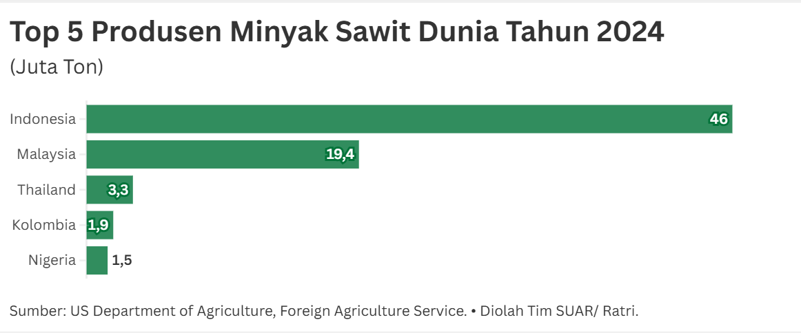 - Di tengah ketegangan terkait tarif dagang di tahun 2025, dinamika perdagangan minyak sawit Indonesia ke Amerika Serikat dan Uni Eropa menunjukkan kemiripan. Di kedua pasar tersebut, volume ekspor minyak sawit Indonesia menurun, namun dari sisi nilai angkanya meningkat. Secara global, Indonesia produsen minyak sawit terbesar dunia dengan capaian sebesar 46 juta ton. Jumlah ini jauh melampaui Malaysia di posisi kedua dengan 19,4 juta ton serta produsen lainnya seperti Thailand dan Kolombia. Dominasi Indonesia yang tinggi ini menjadi alat tawar ketika berhadapan dengan pasar-pasar besar yang memiliki regulasi ketat.