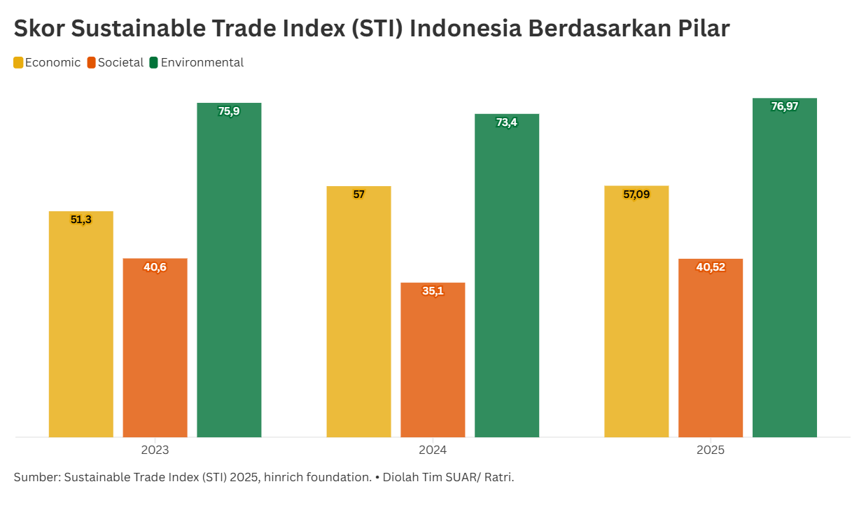 - Secara global, Indonesia menempati peringkat ke-17 dari 30 perdagangan berkelanjutan. Dengan skor keseluruhan sebesar 56,3, posisi Indonesia naik satu peringkat dibandingkan tahun 2024. Kenaikan ini mencerminkan konsistensi Indonesia dalam menyelaraskan ambisi pertumbuhan ekonomi dengan tanggung jawab sosial dan lingkungan di tengah tekanan geopolitik dunia. Jika dibandingkan dengan negara tetangga di Asia Tenggara, Indonesia masih berada di bawah Singapura (peringkat 4), Thailand (peringkat 12), Vietnam (peringkat 14), dan Malaysia (peringkat 15). Namun, Indonesia berhasil mengungguli negara besar seperti Tiongkok yang berada di peringkat 18 dan India di peringkat 22.