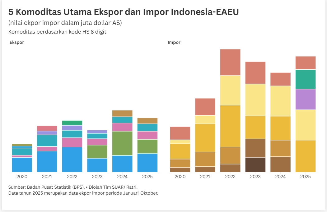 - Penandatanganan Perjanjian Perdagangan Bebas (FTA) antara Indonesia dan Uni Ekonomi Eurasia (EAEU) yang direncanakan pada 21 Desember 2025 di Rusia merupakan momen penting untuk hubungan dagang kedua pihak. Dengan adanya perjanjian ini terbuka peluang meningkatkan kinerja ekspor ke negara-negara EAEU. Berdasarkan data dari Badan Pusat Statistik (BPS), Indonesia mengalami defisit perdagangan dengan negara-negara EAEU selama periode 2020-2025. Hal ini didorong oleh tingginya impor pupuk dan bahan bakar mineral dari EAEU, sementara ekspor Indonesia didominasi oleh minyak kelapa sawit.