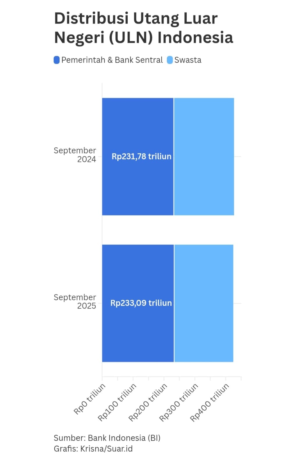 - Bank Indonesia (BI) mengumumkan utang luar negeri (ULN) Indonesia turun 1,82% ke posisi USD 424,4 miliar pada kuartal III-2025, dari sebelumnya sebesar USD 432,3 miliar pada kuartal II-2025. Secara tahunan, ULN Indonesia berkurang 0,6% year-on-year (YoY) pada kuartal III, setelah pada kuartal III-2024 sebesar USD 426,84 miliar, yang antara lain dipengaruhi oleh melambatnya pertumbuhan ULN di sektor publik serta kontraksi ULN di sektor swasta. Sekalipun penurunan ULN membantu menjaga persepsi stabilitas neraca dan risiko eksternal Indonesia, dunia usaha memiliki pertimbangan lain dalam mengupayakan pembiayaan luar negeri, termasuk arah suku bunga global, stabilitas nilai tukar, dan ketersediaan likuiditas global.