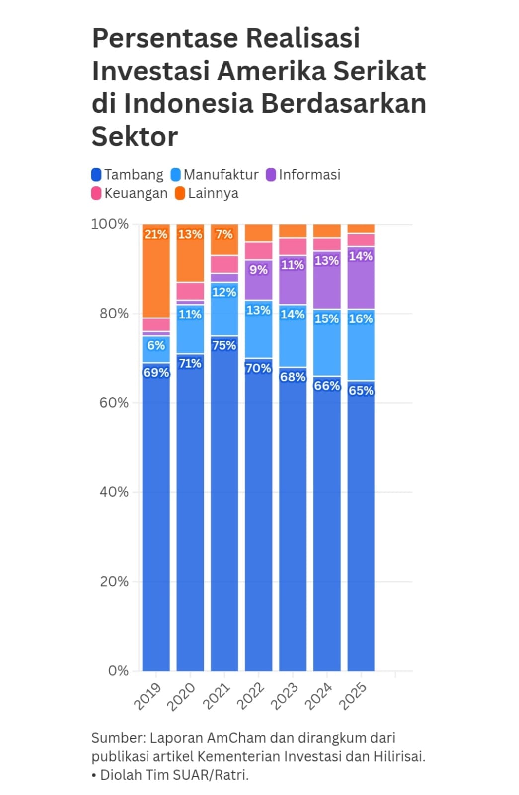 - Data dari Kementerian Investasi dan Hilirisasi/BKPM mencatat sepanjang 2025 ini (Januari-September), realisasi investasi AS di Indonesia sudah mencapai USD 2,3 miliar, dengan jumlah proyek sebanyak 3.664 proyek. Pada triwulan III-2025, Amerika Serikat merupakan negara investor dengan realisasi investasi peringkat ke-5 di Indonesia senilai USD 768,5 juta. Total ada 2.435 proyek yang tengah berjalan. Namun, secara akumulatif, sepanjang triwulan I–III 2025 nilai investasi dari AS yang mencapai USD 2,325 miliar menempatkannya di peringkat ke-6 terbesar setelah Singapura, Hong Kong, Tiongkok, Malaysia, dan Jepang.