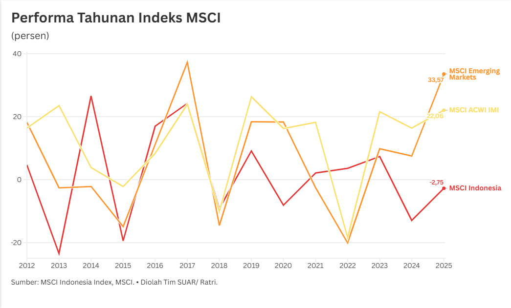 - Mengacu pada Fact Sheet MSCI Indonesia Index, saat ini terdapat 18 emiten yang mencakup sekitar 85% dari seluruh ekuitas di Indonesia yang masuk dalam indeks tersebut. Secara historis, performa kumulatif MSCI Indonesia menunjukkan tren yang jauh tertinggal dibandingkan indeks global lainnya. Dalam grafik rentang Desember 2010 hingga Desember 2025, nilai investasi di MSCI Indonesia hanya tumbuh tipis ke angka USD 110,03. Sementara indeks MSCI Emerging Markets mencapai USD 175,40 dan MSCI ACWI IMI melonjak drastis hingga USD 397,57.