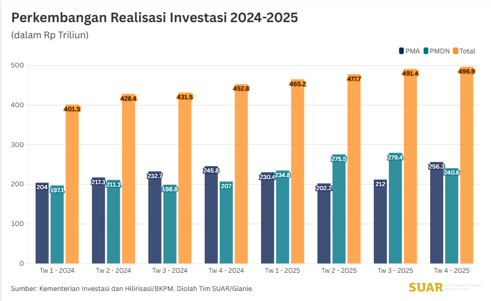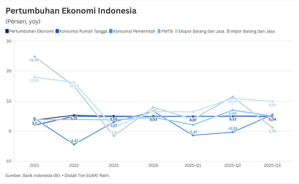 - Laporan Perekonomian Indonesia oleh Bank Indonesia (BI) mencatat perekonomian Indonesia pada tahun 2024 cukup resilien di angka 5,03% (yoy). Sebuah capaian yang diproyeksikan juga terjadi di tahun 2025 dan akan dijaga pada rentang 4,9% hingga 5,7% pada tahun 2026. Dilihat dari sisi pengeluaran, pembentukan modal tetap bruto (PMTB) atau investasi lebih unggul dengan pertumbuhan yang sangat progresif, melampaui laju pertumbuhan konsumsi rumah tangga dalam kuartal II-2025 dan III-2025. Investasi ini sebagian besar mengalir ke aset-aset tetap seperti mesin, infrastruktur, dan pembangunan industri hilir.