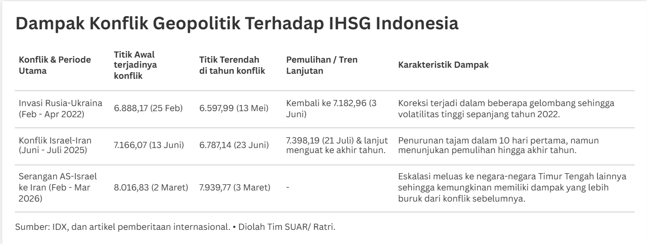 - Eskalasi serangan AS-Israel ke Iran pada akhir Februari 2026 yang disusul serangan balasan meluas hingga ke negara-negara Teluk seperti Qatar dan Arab Saudi turut berdampak pada Bursa Efek Indonesia. Pada pembukaan perdagangan 2 Maret 2026, Indeks Harga Saham Gabungan (IHSG) langsung merosot ke level 8.016,83 dan terus tertekan hingga menyentuh 7.939,77 pada 3 Maret 2026. Jika menilik ke belakang pada invasi Rusia-Ukraina tahun 2022, pola pergerakan IHSG menunjukkan karakter volatilitas bergelombang dinamis sepanjang tahun. Saat itu, IHSG tidak langsung jatuh seketika, melainkan mengalami tekanan bertahap hingga menyentuh titik terendah di 6.597,99 pada Mei 2022, atau sekitar tiga bulan setelah invasi dimulai. Jika pada 2022 pemulihan membutuhkan waktu 5 bulan-6 bulan dan pada 2025 hanya butuh 1 bulan, maka di tahun 2026 ini, kecepatan pemulihan akan bergantung pada seberapa cepat deeskalasi terjadi di kawasan Teluk untuk menjamin kelancaran arus logistik minyak bumi.