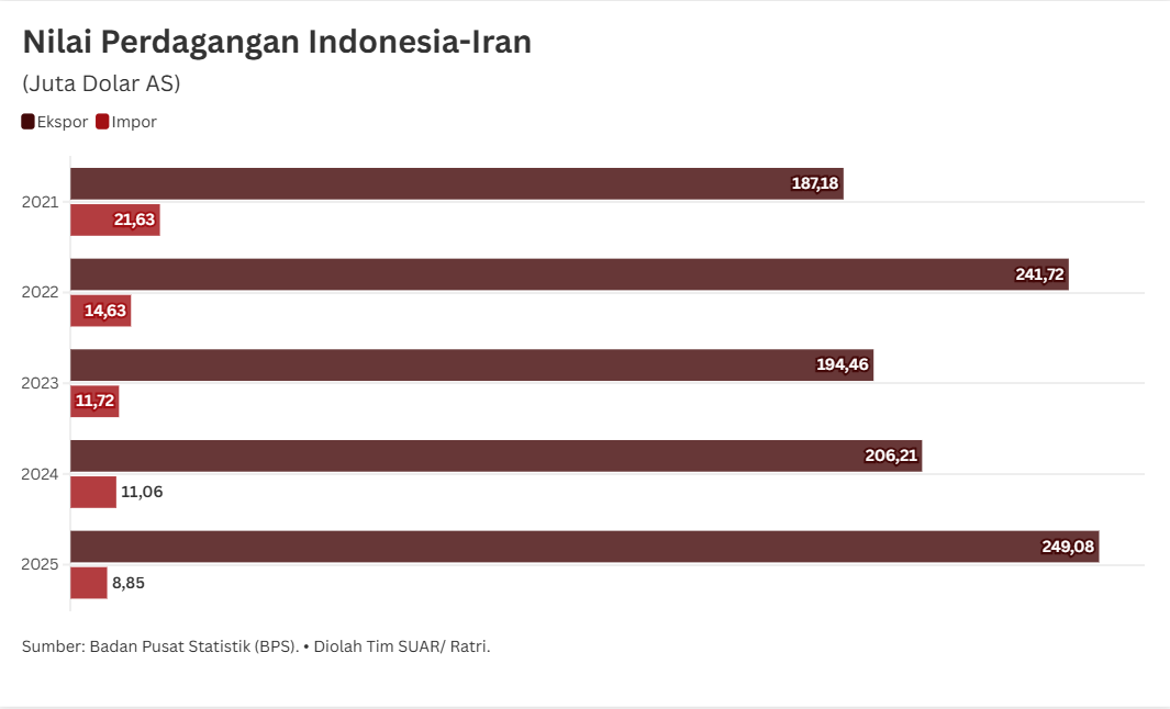 - Hubungan dagang antara Indonesia dan Iran dalam lima tahun terakhir menunjukan kinerja yang positif dengan mencatatkan surplus perdagangan bagi Indonesia. Data Badan Pusat Statistik (BPS) menunjukkan, perdagangan bilateral kedua negara periode 2021–2025 secara konsisten mencatatkan surplus bagi Indonesia. Dari sisi komoditas, Indonesia mengandalkan sektor agrikultur dan manufaktur ringan sebagai mesin ekspor utama. Sementara itu, profil impor Indonesia dari Iran didominasi oleh komoditas yang bersifat spesifik dan strategis.