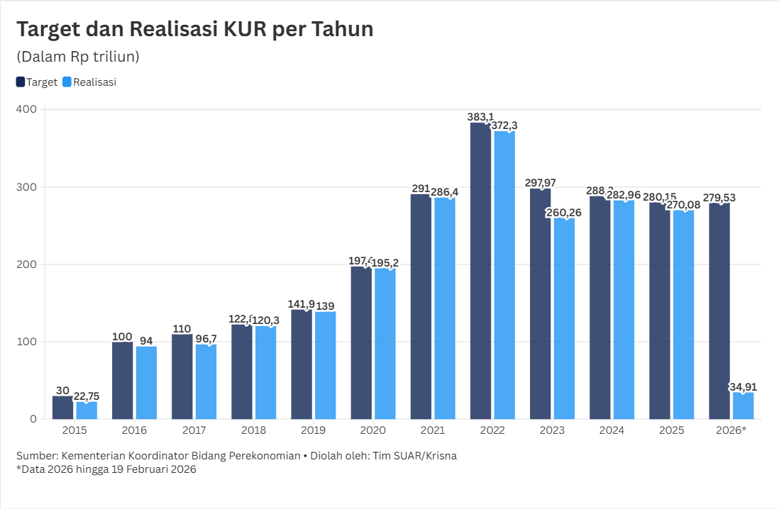 - Pemerintah menargetkan penyaluran Kredit Usaha Rakyat (KUR) pada 2026 sebesar Rp279,53 triliun agar mampu mendorong permintaan dan konsumsi dalam negeri demi menjaga momentum pertumbuhan. Ferry melaporkan, hingga 19 Februari 2026, KUR telah tersalurkan sebesar Rp34,91 triliun atau 12,49% dari target dan diterima oleh 581.453 debitur. Dengan demikian, total outstanding KUR saat ini telah mencapai Rp460 triliun, diberikan kepada 54,48 juta debitur, dengan rasio non-performing loans (NPL) sebesar 2,19%.