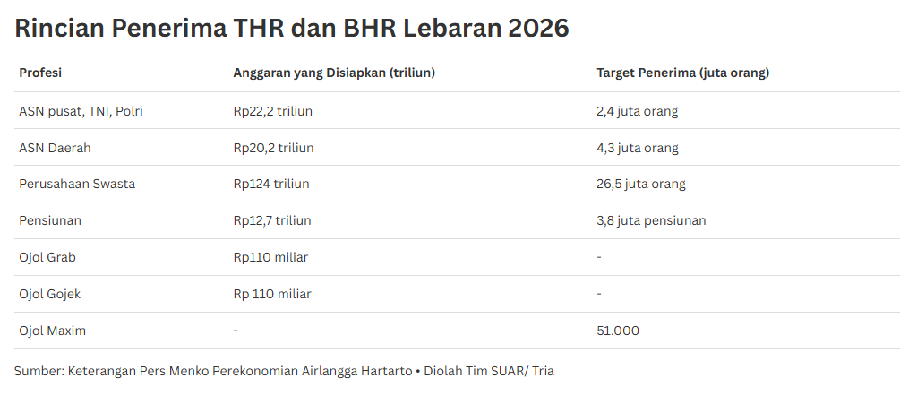 - Pemerintah pada Selasa (3/3/2026) memastikan sebanyak 851.500 mitra pengemudi ojek dan taksi online akan menerima Bonus Hari Raya (BHR) Idul Fitri 1447 H, yang wajib dicairkan maksimal H-7 Lebaran. Hal ini dilakukan untuk terus menjaga daya beli masyarakat sekaligus mendorong penguatan pertumbuhan ekonomi nasional pada kuartal pertama tahun 2026. Besaran BHR yang diterima mitra pengemudi diperkirakan berkisar antara Rp150.000 untuk kendaraan roda dua dan Rp200.000 untuk roda empat, bergantung pada tingkat keaktifan mereka.