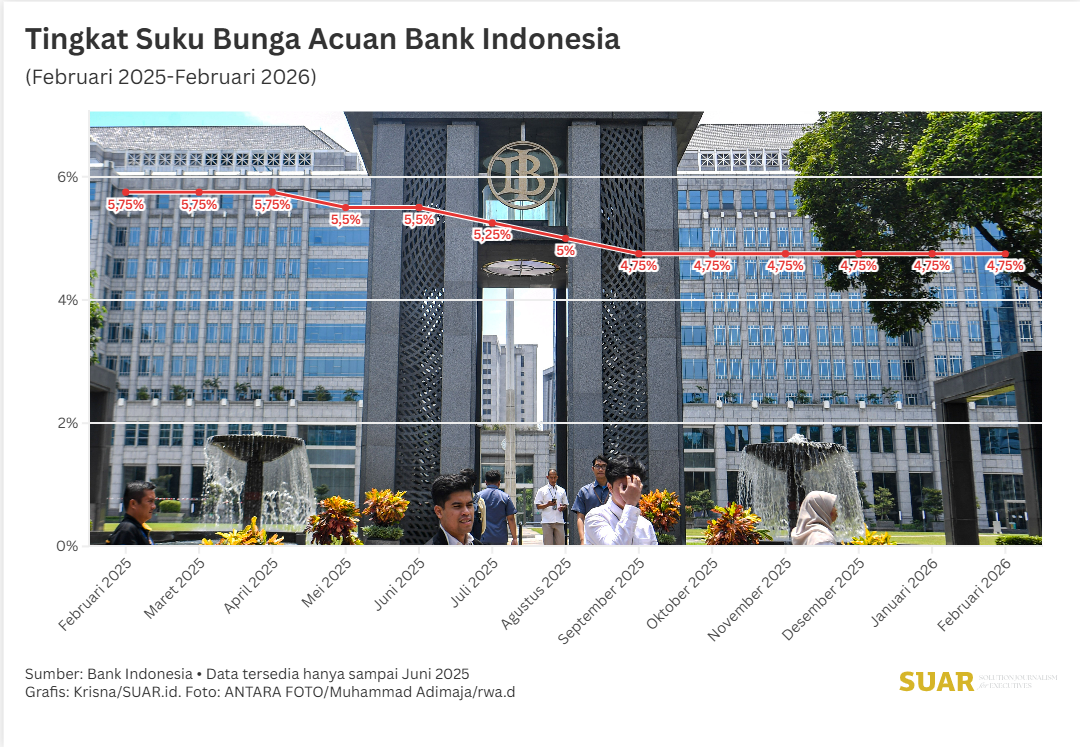 - Nilai tukar rupiah terhadap dollar AS mengalami tren pelemahan hingga nyaris menembus level psikologis Rp 17.000. Bank Indonesia (BI) menilai pelemahan ini karena nilai rupiah berada di bawah nilai fundamentalnya atau undervalued. Otoritas moneter Tanah Air menilai pergerakan nilai tukar rupiah saat ini tidak dipengaruhi faktor fundamental. Sebab, indikator inflasi, pertumbuhan ekonomi, imbal hasil SBN, maupun indikator lain dalam posisi baik sehingga nilai tukar rupiah seharusnya menunjukkan penguatan. Pelemahan nilai tukar rupiah tersebut dipengaruhi tingginya ketidakpastian pasar keuangan global di tengah meningkatnya permintaan valuta asing oleh kelompok korporasi domestik. Berkaca dari kondisi tersebut, Rapat Dewan Gubernur BI Februari 2026 memutuskan untuk mempertahankan BI Rate sebesar 4,75%, suku bunga Deposit Facility sebesar 3,75%, dan suku bunga Lending Facility sebesar 5,50%.