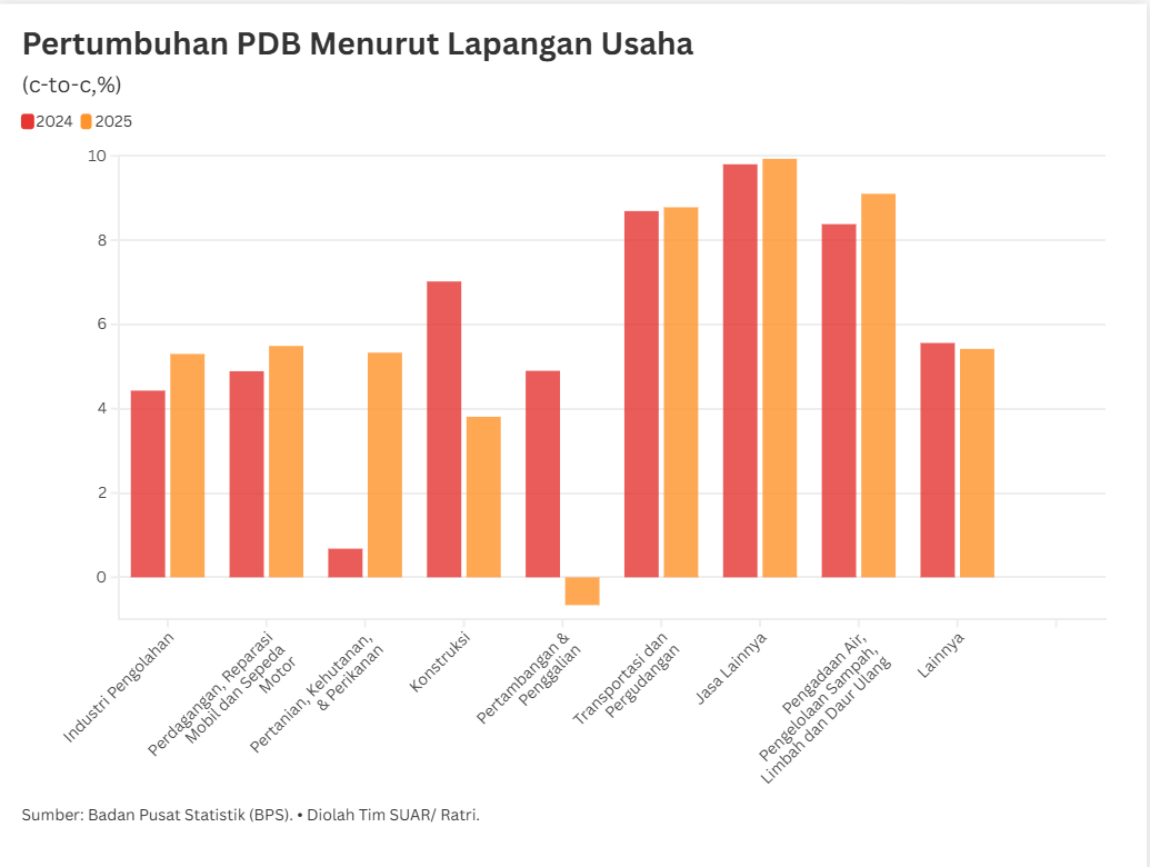 - Ditinjau dari sisi lapangan usaha, sektor perdagangan tetap menjadi salah satu kontributor utama yang menopang struktur perekonomian nasional. Data Badan Pusat Statistik (BPS) menunjukkan sektor perdagangan tumbuh sebesar 5,49%, meningkat dibandingkan pertumbuhan tahun sebelumnya yang berada di level 4,89%. Peningkatan ini selaras dengan pulihnya konsumsi rumah tangga dan aktivitas distribusi barang di seluruh wilayah Indonesia. Selain perdagangan, sektor lain seperti transportasi dan pergudangan juga mencatatkan pertumbuhan signifikan di angka 8,78%, yang secara tidak langsung memberikan dukungan logistik bagi arus barang domestik maupun internasional.
