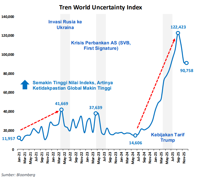 - Lima gejala utama membayangi arah ekonomi global sepanjang 2026, yaitu moderasi pertumbuhan di tengah ketidakpastian, reorientasi ekonomi dari berbasis ekspor ke pasar domestik, berhentinya pelonggaran kebijakan moneter, ketidakteraturan peta geopolitik, hingga teknonasionalisme dan bubble asset dalam investasi AI. Segala sesuatu yang dahulu sulit untuk dibayangkan kini mungkin bisa terjadi. Tembusnya batas-batas ketidakmungkinan ini menuntut pelaku usaha untuk bersaing menemukan playbook baru dalam manajemen risiko, khususnya ketika pertumbuhan ekonomi melambat