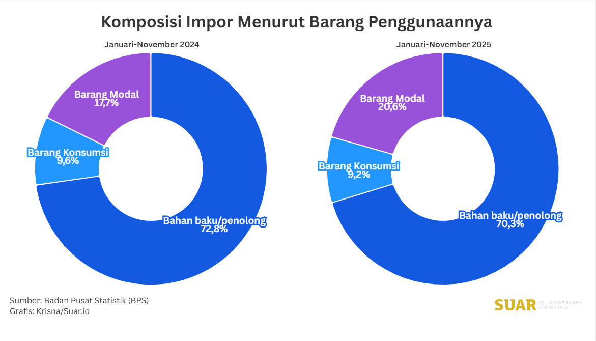 - Lonjakan impor barang modal berasal dari mesin dan peralatan mekanis beserta bagiannya (HS 84), mesin dan perlengkapan elektrik (HS 85) serta kendaraan udara dan bagiannya (HS 88). Pada saat yang sama impor barang bahan mengalami tren penurunan. Pada Januari-November 2025 impor bahan baku mencapai USD 153,19 miliar turun 1,46%. Porsi impor barang baku Januari-November 2025 turun menjadi 70,27% dari total impor, setelah pada tahun sebelumnya porsinya 72,8%.