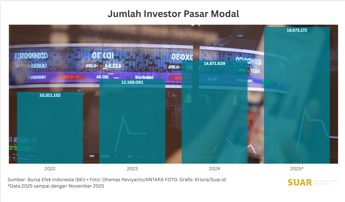 - Mengutip data Kustodian Sentral Efek Indonesia (KSEI) total investor pasar ritel Single Investor Identification (SID) pasar modal melonjak 5,25 juta dalam setahun. Pada 2024 jumlahnya 14,87 juta lantas meroket menjadi 20,12 juta pada 19 Desember 2025. Lonjakan jumlah investor ritel itu juga mengubah struktur transaksi di pasar modal. Otoritas Jasa Keuangan (OJK) mencatat kontribusi investor ritel terhadap nilai rata-rata transaksi harian saham di Bursa Efek Indonesia (BEI) melonjak dari 38% pada akhir 2024 menjadi sekitar 50% sepanjang 2025. Artinya, kini nilai transaksi dibagi rata seimbang antara investor ritel dan investor korporasi.