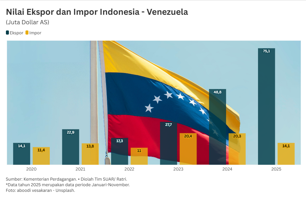 - Ketegangan geopolitik global kembali meningkat seiring dengan invasi Amerika Serikat terhadap Venezuela. Peristiwa ini memicu kekhawatiran instabilitas ekonomi di kawasan Amerika Latin, mengingat posisi strategis Venezuela sebagai salah satu pemilik cadangan minyak terbesar di dunia. Berdasarkan data Kementerian Perdagangan RI, hubungan dagang Indonesia-Venezuela cukup dinamis dalam lima tahun terakhir. Pada periode 2020 hingga 2022, nilai ekspor dan impor cenderung stabil. Mulai tahun 2023, terjadi peningkatan nilai ekspor Indonesia ke Venezuela yang cukup signifikan, yakni mencapai USD 27,7 juta, sementara impor berada di angka USD 20,4 juta. Hal ini menandakan adanya penguatan penetrasi produk Indonesia di pasar Venezuela.